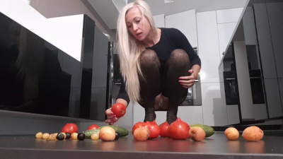 Goddess Nika has a foot crush fetish and she loves to crush and destroy things. Today she did not have anything to crush and she was not content to stay without crushing anything. She chose to check out her fridge and she found things to crush there. She crushed the fruits and vegetables she found in the fridge and she created a mess which she had her slave clean once she was done.