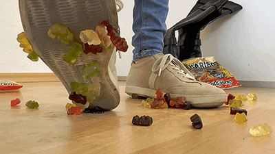 Madame Marissa discovered that her slave was messing with her. He left gummy bears all over the place knowing she would be pissed off. She was pissed off alright and she used her sneakers to crush and trample on the gummy bears. She made sure to destroy them all and then leave the mess for her slave to clean up. She warned him of doing so again and told him she would crush him instead of the gummy bears next time he did that.