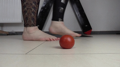 Lady Karame loves food crushing and today she was crushing tomatoes. She threw a tomato on the floor and she used her bare feet to crush it. She crushed it into a pulp and created a mess on the floor. That was her intention and she used the mess to humiliate her slave not as punishment, but for fun. She had him lick the floor clean and do the same to her feet.