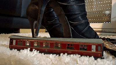 Madame Marissa was bored at home. She went to the garage to sort things and found a toy train. She abandoned the sorting and went with it to the house. She placed it on her carpet and she wore her high heel boots. She used the boots to crush the toy train and make sure it was in pieces and it was totally destroyed. When she was done, she threw it in the trash.